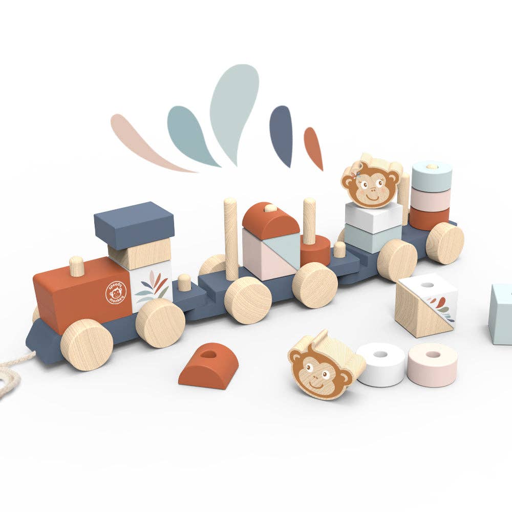 Description A fun wooden pull-along train stacker, painted in trending soft colors and featuring our favorite character, the monkey. Your little one will have hours of fun, stacking elements on the train and building houses with colorful blocks. Once everyone on board, choo choo off goes the train for a new adventure! This toy is crafted from sustainably sourced wood from FSC® certified forests. Presented in a beautiful gift box.