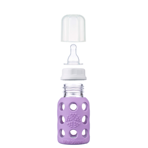 The perfect starter bottle for baby. The Lifefactory 4oz borosilicate glass baby bottle comes with a silicone sleeve, polypropylene cap, ring, and stopper, and a Stage 1 (0-3 months) silicone nipple. These are wonderfully easy to clean: the bottle stays inside the silicone sleeve, and go right in the dishwasher. Buy a set of four and you'll have an extra in the fridge, ready for your daily routine. Made with high-quality materials and baby-friendly designs: you'll love these neat little bottles as much as your baby does! Size: 2.5"W x 2.5"D x 6"D.
