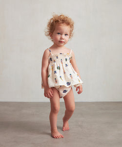 Its darling silhouette and ease of wear make this linen shirred top and bloomer set a repeat best-seller. A no-brainer for adorable summer dressing.
