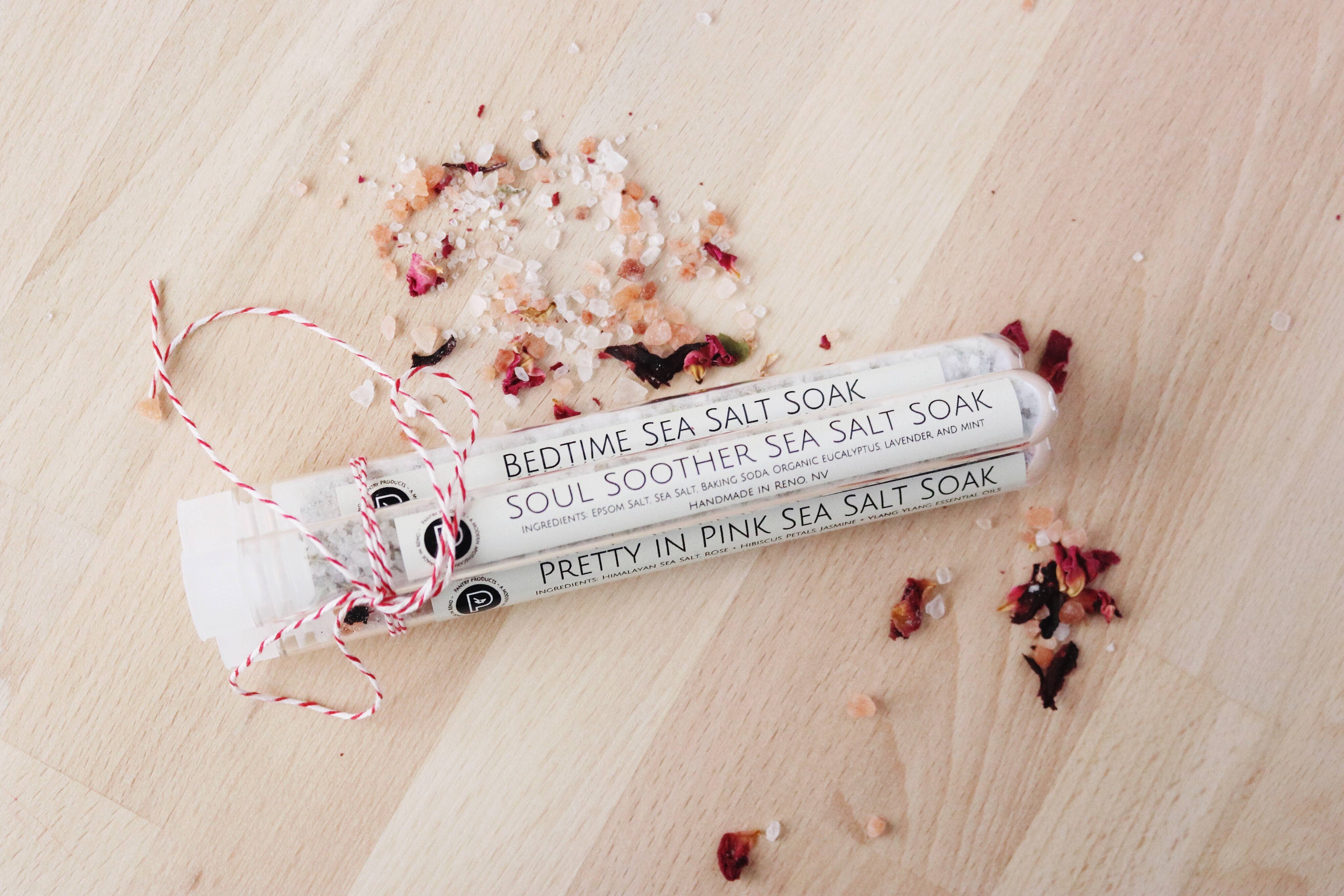 Soul Soother: Epsom Salt, Sea Salt, Baking Soda, Dried Eucalyptus, Dried Spearmint, Dried Peppermint, Rose Petals, Eucalyptus, Spearmint, Camphor Essential Oils