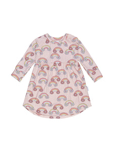 - Super soft, premium organic cotton jersey long sleeve drop back swirl dress with all over daisy rainbow print