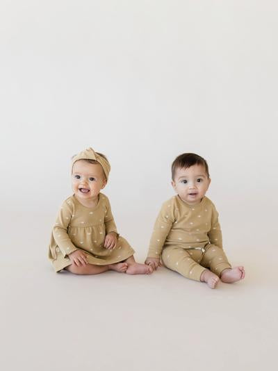 Velvety soft long sleeve baby dress. Pairs perfectly with our gathered bloomers! All sizes have a snap at the shoulder for easy changing.