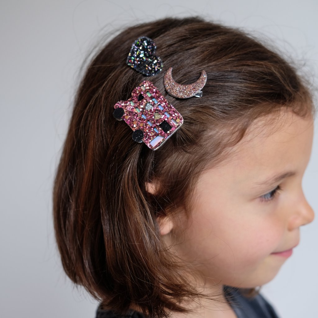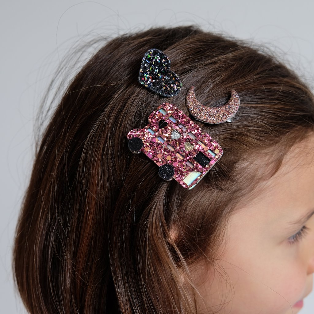 A clip set inspired by London at night, this magical little set features a chunky glitter London bus, gold moon and black & multi glitter heart. All with concealed alligator clips these would be great in finer hair and would make a great gift for little ones who love bus trips!