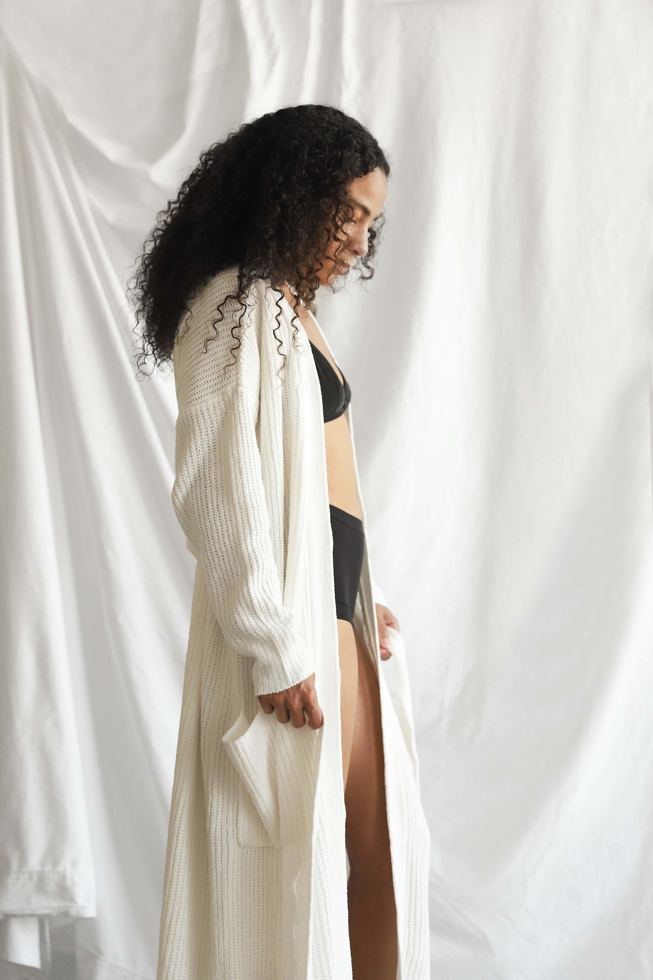 An ultra-soft, loose-fit, microfiber open robe/sweater hybrid with two front pockets.