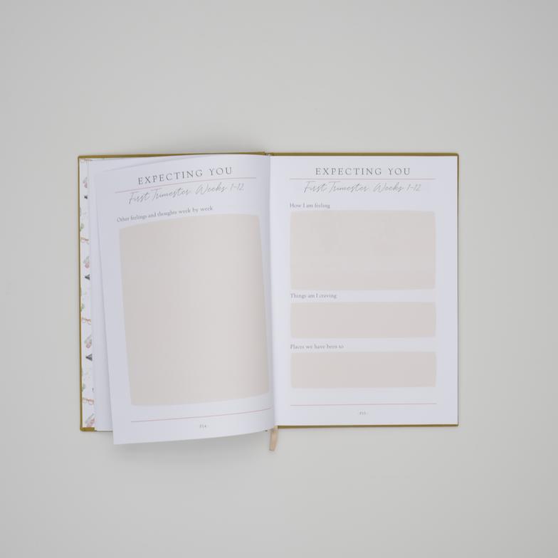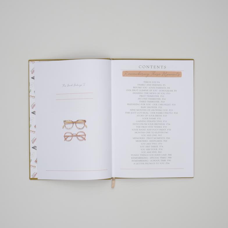 - Guided Illustrated journal with prompts to record precious moments
