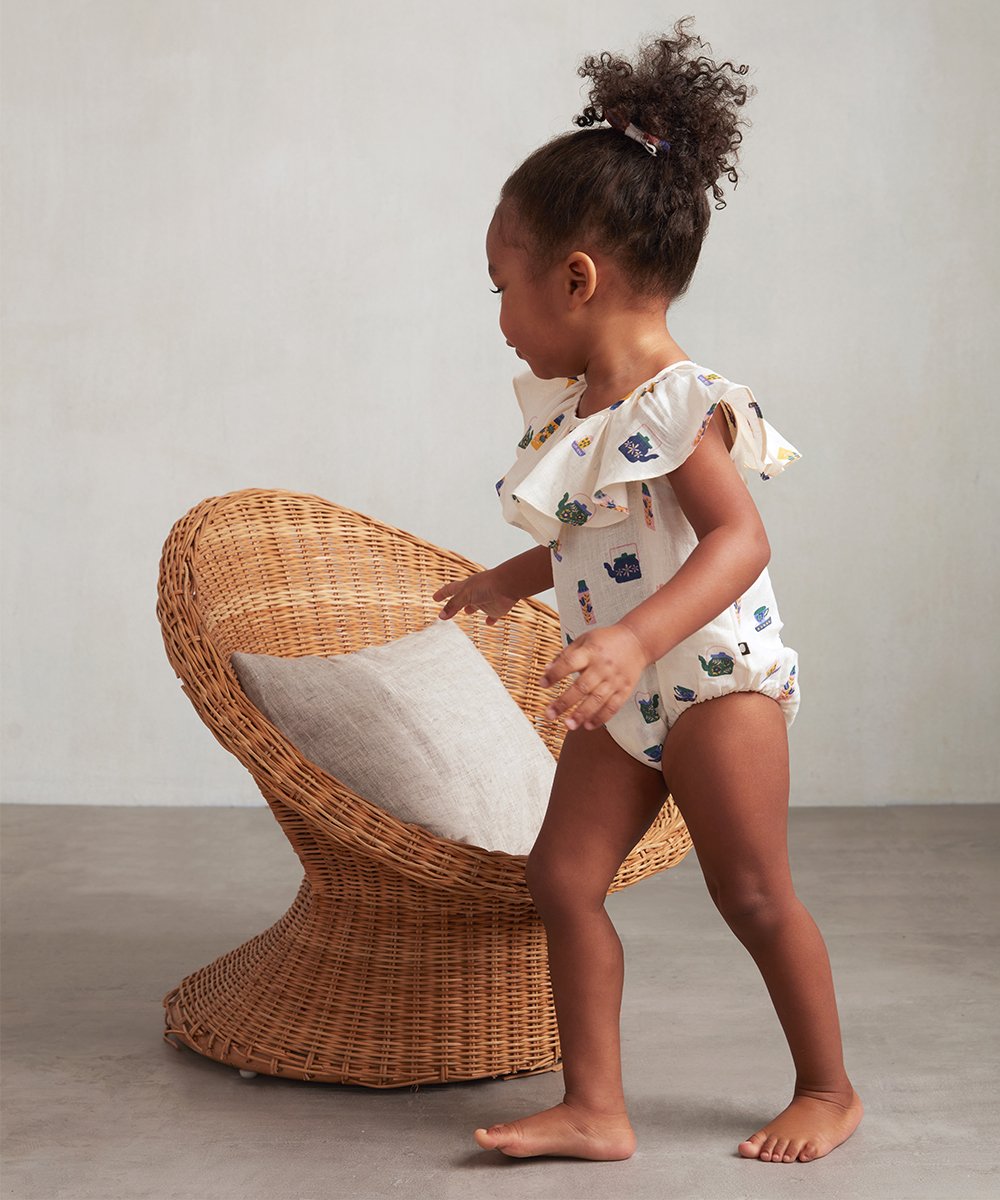 Afternoon playtime is a breeze in this sleeveless linen bubble romper with a sweet ruffle collar.