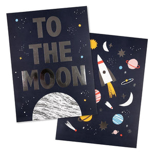 Perfect for the room of any aspiring astronaut. These two prints feature planets, rockets, and stars in bright colors and shiny silver foil. They will look out-of-this-world in a free-standing frame or hung on a wall.