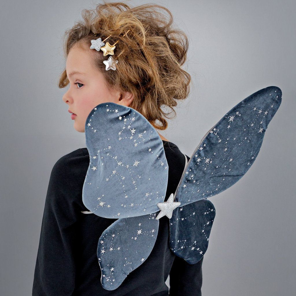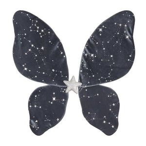 In the most magical charcoal grey starry velvet fabric, with a satin backing, these wings have elasticated straps and a glitter star at the center. A magical gift idea!